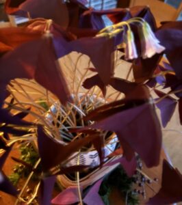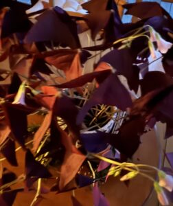 Years ago, when I bought a struggling plant on the sale table at a local garden store, I didn’t know what I was getting. I was attracted to the purply-maroon, triangular-shaped, butterfly-looking leaves, but didn’t know the name of the plant. I later learned its botanical name, oxalis traiangularis, commonly called ruby shamrock, purple shamrock, or false shamrock.